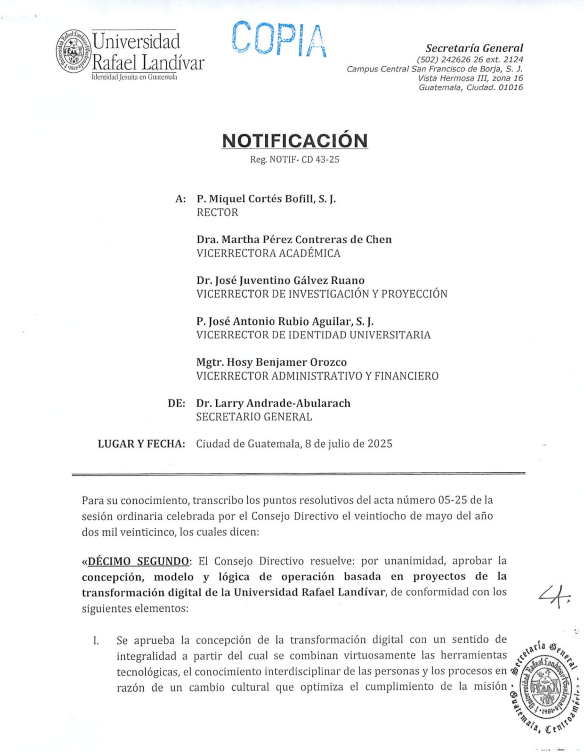 La Universidad Rafael Landívar ha fortalecido de su misión institucional al aprobar oficialmente la concepción y el modelo de transformación digital con un enfoque integral. Esta decisión, sustentada en las orientaciones del Plan Estratégico Institucional 2022-2030, reconoce la importancia de combinar tecnología, conocimiento interdisciplinario y procesos organizacionales como base de un cambio cultural profundo. A través de un modelo que prioriza componentes estratégicos y una lógica operativa basada en proyectos, la universidad institucionaliza un camino hacia la innovación continua. Con ello, no solo se optimiza el uso de la tecnología, sino que se refuerza la capacidad de evaluación, aprendizaje y toma de decisiones, todo en función del cumplimiento pleno de su misión académica y social.