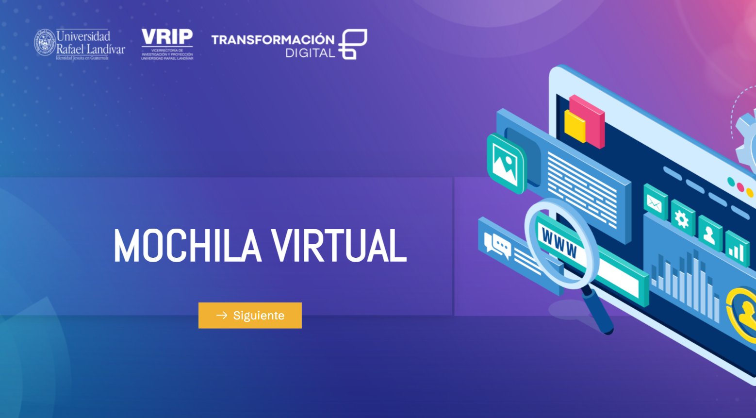 La Mochila Virtual de la Universidad Rafael Landívar reúne aquellas aplicaciones y herramientas a las que los estudiantes pueden acceder con su correo institucional, como Amazon Web Services, Microsoft 365 o Figma, además de otras plataformas recomendadas que apoyan el estudio, la organización del trabajo académico y la colaboración en entornos virtuales.